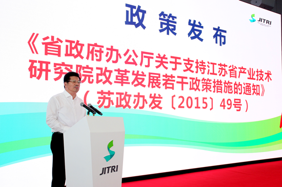省政府徐南平副省长为省产研院技术交易市场揭牌并发表讲话,省政府王志忠副秘书长发布了省政府办公厅关于支持江苏省产业技术研究院改革发展的若干政策措施(苏政办发﹝2015﹞49号),省产研院欧阳平凯院长点击开通苏技e网络平台,省科技厅副厅长夏冰等领导出席了会议。徐南平在讲话中说,建设省产研院是省委、省政府着眼实施创新驱动发展战略、加快建设创新型省份的全局作出的重要决策部署。这次十条支持政策措施的出台,充分体现了省委、省政府对省产研院建设的高度重视,为省产研院改革发展注入了强大动力。希望省产研院抓住机遇,紧紧围绕建成世界有影响、全国最前列产业技术研发组织的目标,加大改革创新力度,种好改革“试验田”,争当科技体制改革的先锋;建设好技术交易市场,加快加快培育研发产业;更大力度抓落实,提高对江苏转型升级和经济发展的贡献度。